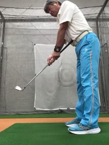 グリップエンドをお腹につけてまま、腕や手を使わず9時の高さまでテークバック。