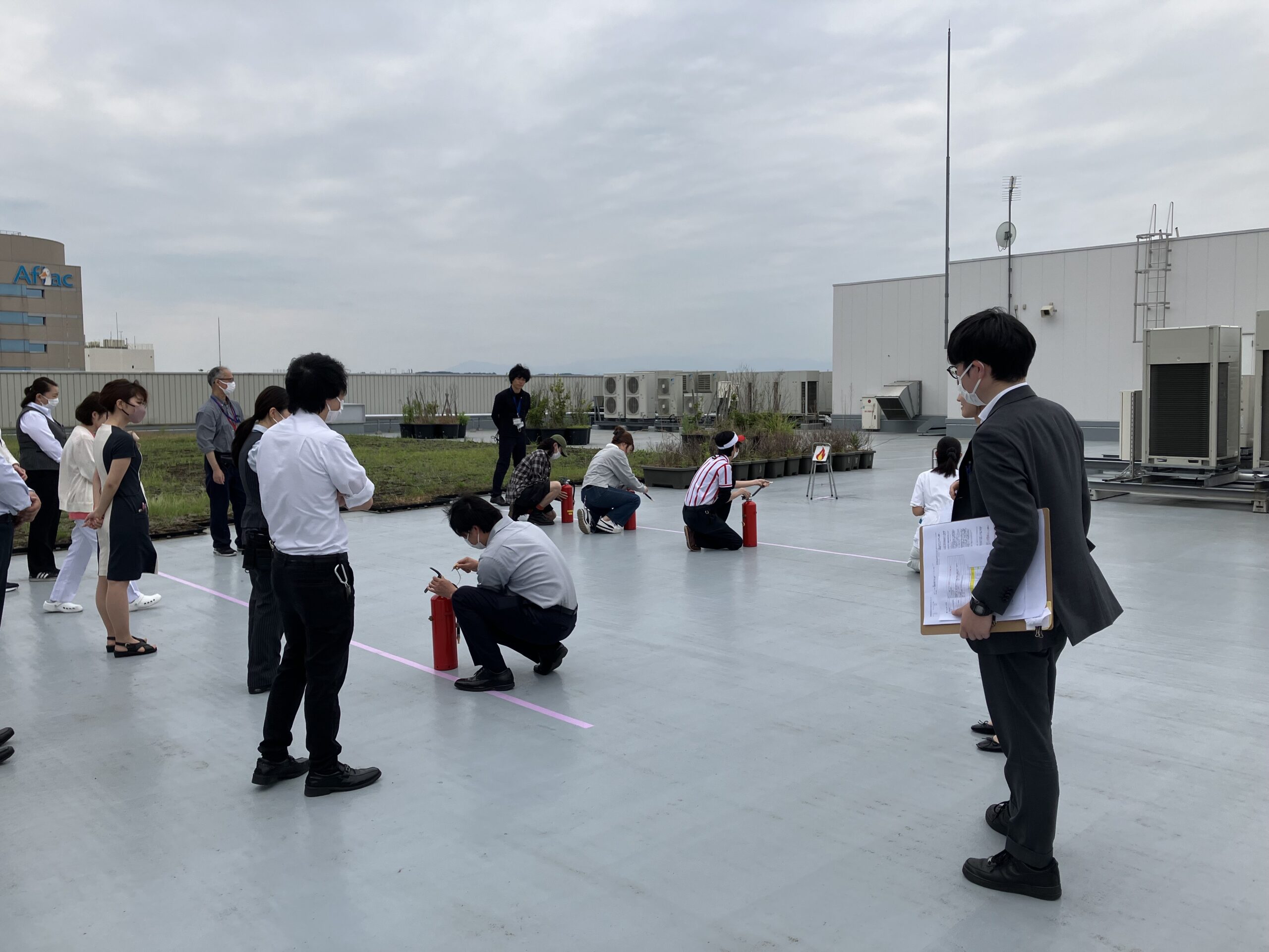 本日は、店舗のある屋上にて消防訓練と非難経路の確認を行いました。