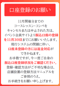 イベント実施は11月末までとさせていただき、11月開催分のコースレッスン・コンペのキャンセルは11月30日までに、振込口座登録をお願い致します。