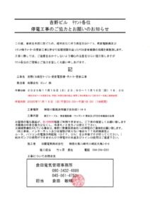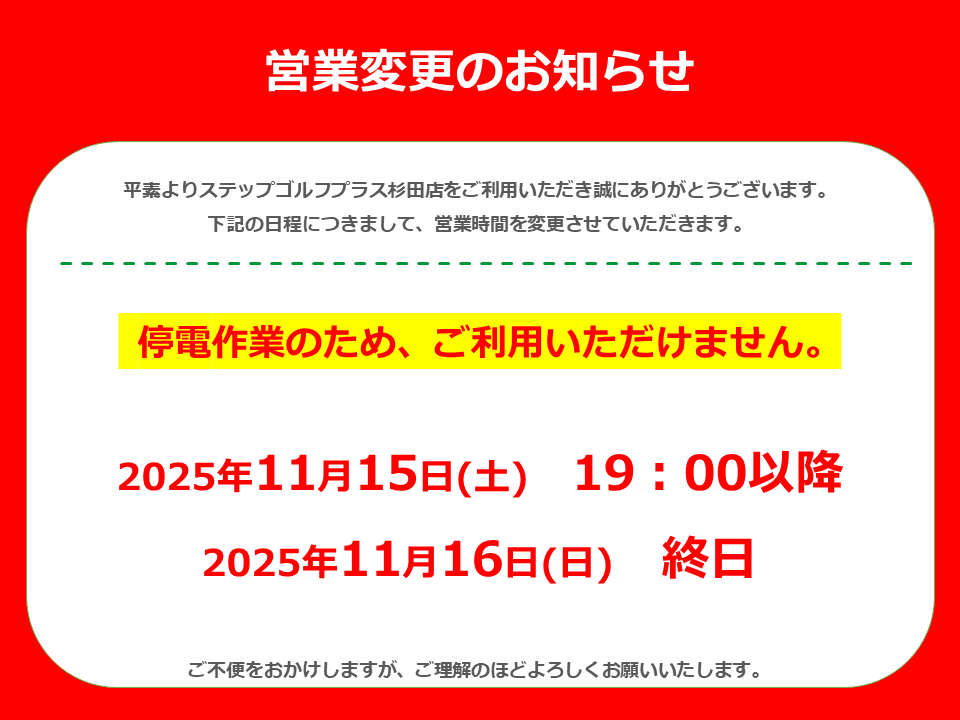 11月16日(日)※正確には前日の夜中から、ステップゴルフプラス杉田店の入っている吉野ビルで電力関連の工事が行われます。