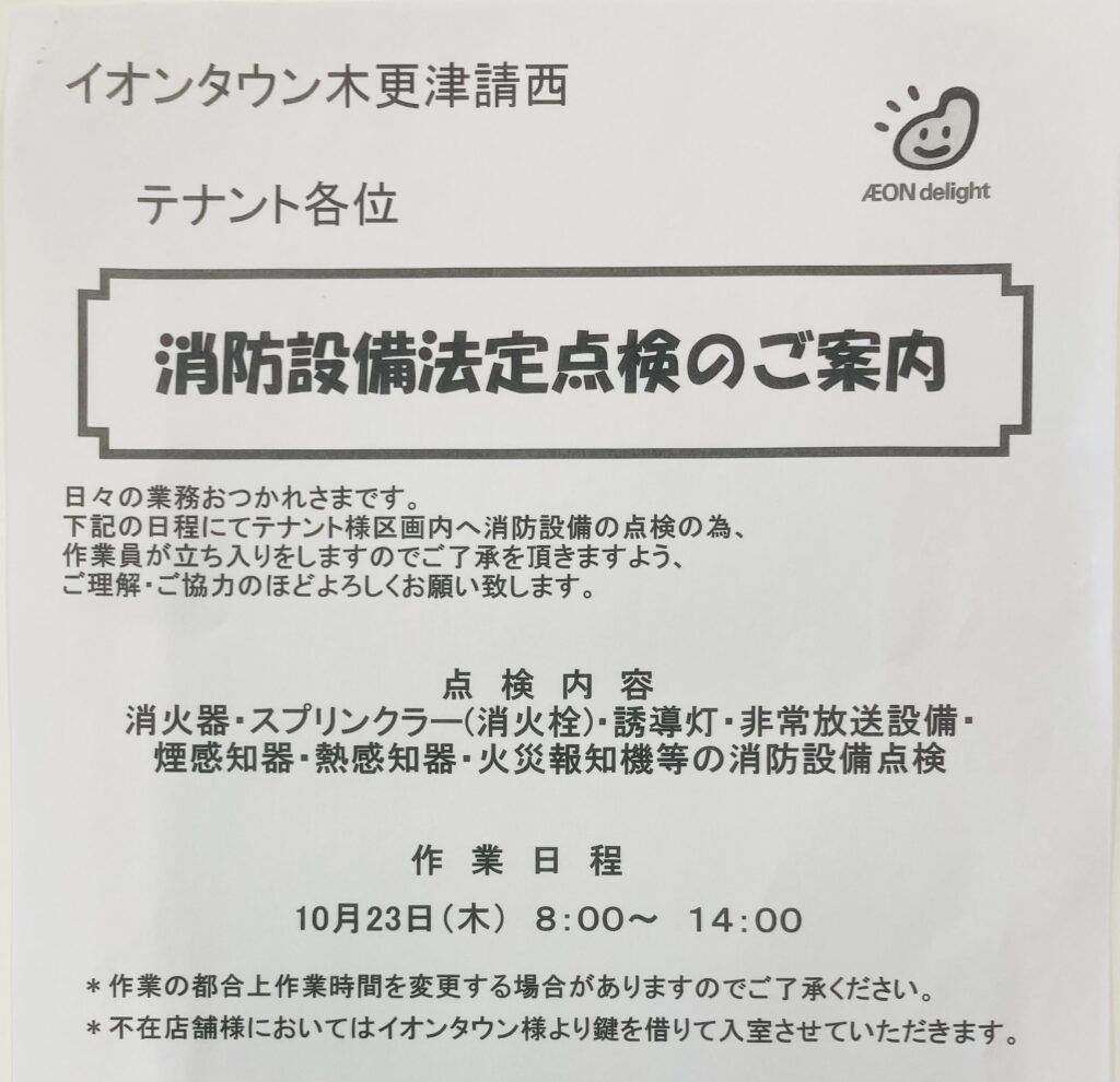 10月23日(木) 午前8:00~12:00の時間帯に消防設備法定点検の為、作業員が立ち入ります。