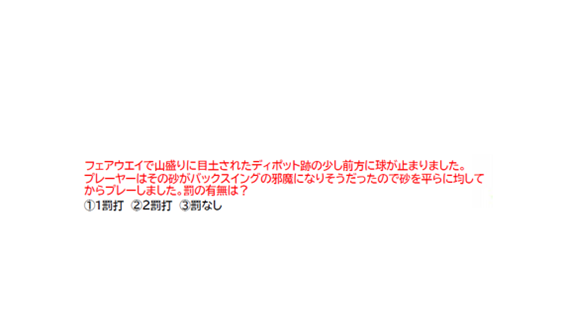 Q46 フェアウエイで山盛りに目土されたディポット跡の少し前方に球が止まりました。プレーヤーはその砂がバックスイングの邪魔になりそうだったので砂を平らに均してからプレーしました。罰の有無は?
