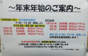 1月4日(土)からレッスンタイム再開し通常営業開始となります。