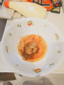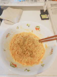 麺を茹でて器にINしたら卵とチーズとマヨを適量、そして混ぜます