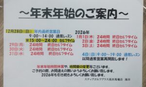 1月4日(土)からレッスンタイム再開し通常営業開始となります。