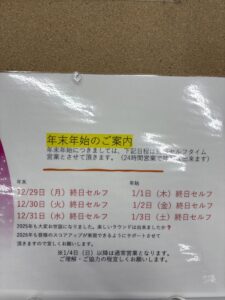 年末年始は終日セルフタイム営業となりますので