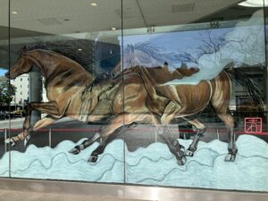 本日出社してみるとソリッドスクエアのガラスに馬の絵が描いてありました。