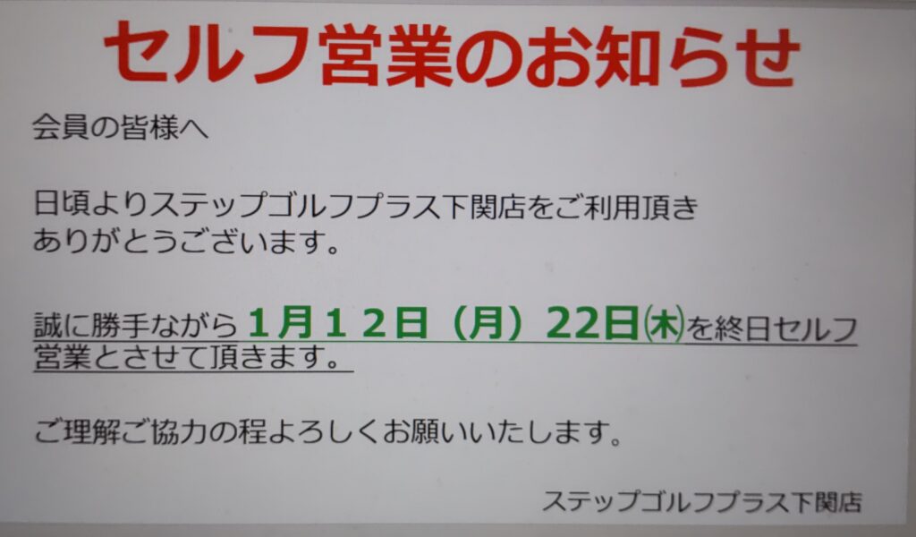 1月12日(月)と22日㈭を終日セルフ営業とさせて頂きます。