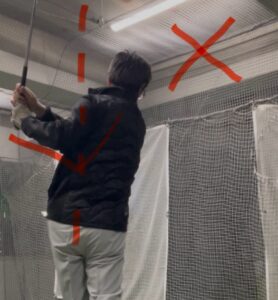 上半身で振っている場合は左肩より外側にいってしまいます。