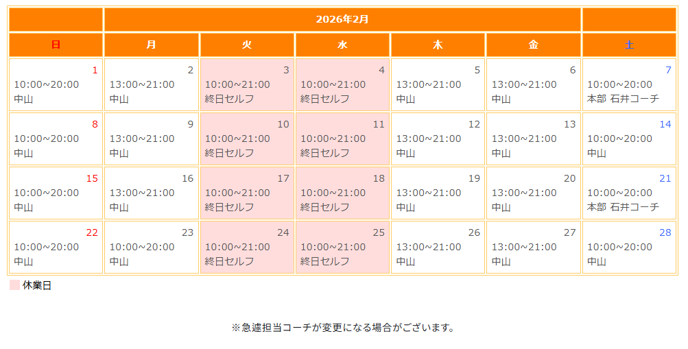 2月 コーチスケージュールのお知らせ