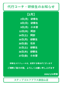 【御嶽ブログ】2月営業案内(代行コーチ・研修生スケジュール)