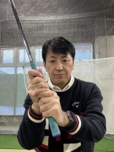 グリップは短く握る。グリップの位置は左足太ももの内側の前付近。