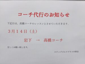 3月14日(土)は、高橋コーチのレッスンとさせていただきます。