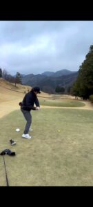 いきなりのティーショットなので、手で合わせに行かず、しっかりと身体を回してミート意識で行きましょう。