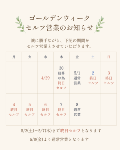 ゴールデンウィークセルフ営業のお知らせ