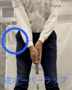 さらに、ショットの時は右手の小指が左手の人差し指の上にのせますがパターの時は逆に左手の人差し指を右手の小指のうえにのせる「逆オーバーラップ」が超基本です。小指の上だけではなく指全体のうえにのせるのもありです。
