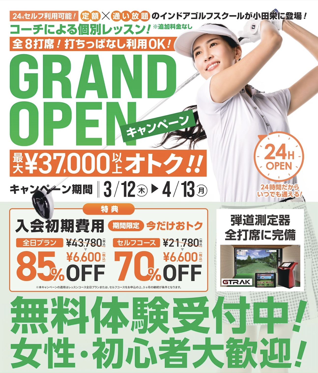 ★神奈川県川崎市のインドアゴルフスクールなら「ステップゴルフプラス小田栄店」 ★ゴルフを始めたい方、女性の方でも安心して通える初心者プログラムも充実!!~無料体験予約受付中!!~ ★新規入会いただいた方に割引キャンペーン実施中!! ★受講制限&回数制限なしのインドアゴルフスクール!! ★ゴルフクラブ&シューズは無料レンタルあり! ★全打席スイングチェックできる解析機付き‼ ★天候に影響されないゴルフ練習場としても利用できます。 ★ライフスタイルに合わせた3つの料金プランをご用意